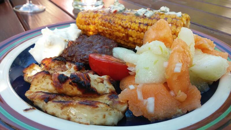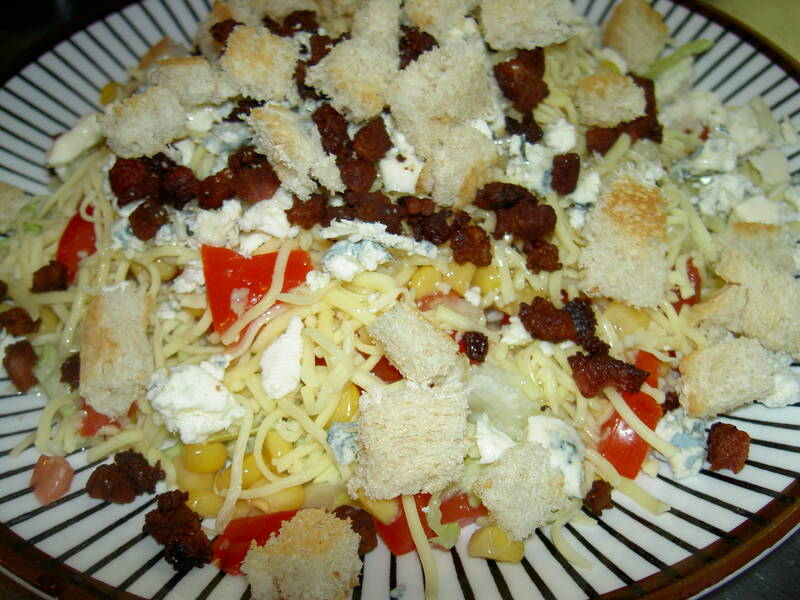 Ädelost, bacon, grönsaker och en giftig vitlöksdressing till – hur gott kan det bli? Mängden ingredienser till själva salladen anpassar man efter omständigheterna.