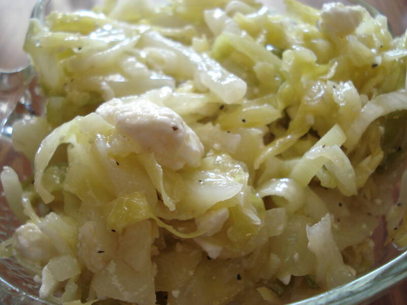 3. Varva vitkål, purjolök och smulad fetaost i en stor bunke med lock.