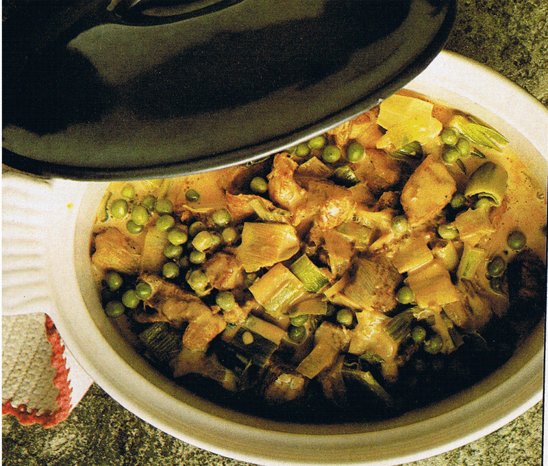 3. Stek köttbitarna, några i taget, i smör i en stekpanna. Salta och peppra och lägg över i en gryta. Häll i 2 dl av ärtspadet. Låt köttet eftersteka under lock på svag värme, ca 15 minuter.