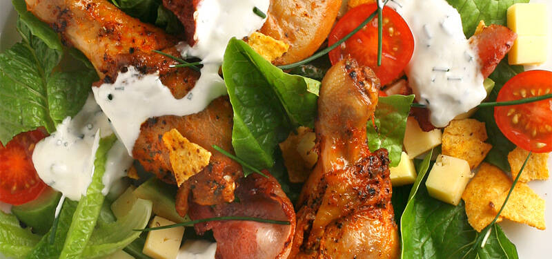 Varför inte göra en lite annorlunda sallad, Tex Mex sallad. Använd Guldfågelns Chicken Drumsticks, bara att värma i ugnen, lite grönsaker, bacon, tortillachips och sås och du har en härligt sallad!