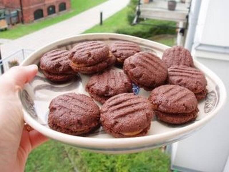 4. Spritsa ut kräm på undersidan av hälften av kakorna. Lägg ihop med resten av kakorna.