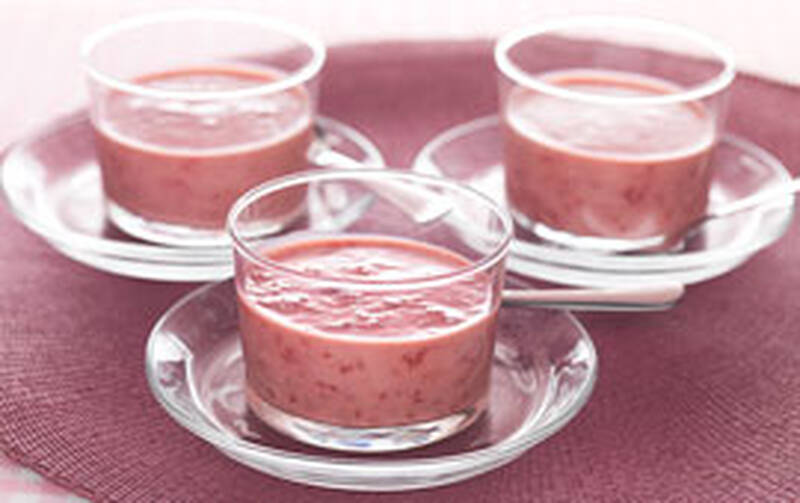 Pannacotta på gräddfil, med kanel som tar fram den goda sötsyrliga smaken i hallonen.