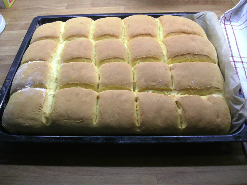 2. Ta upp degen och tryck ut den i en bakpappersklädd långpanna. Skär degen med mjölad kniv i 24 bitar. Strö över mjöl. Ställ långpannan i kylen över natten. Ta ut plåten från kylen och låt brödet jäsa färdigt i rumstemperatur medan ugnen blir 200°C. Nu har rutorna jäst ihop nästan helt, så markera dem igen med mjölad kniv.
