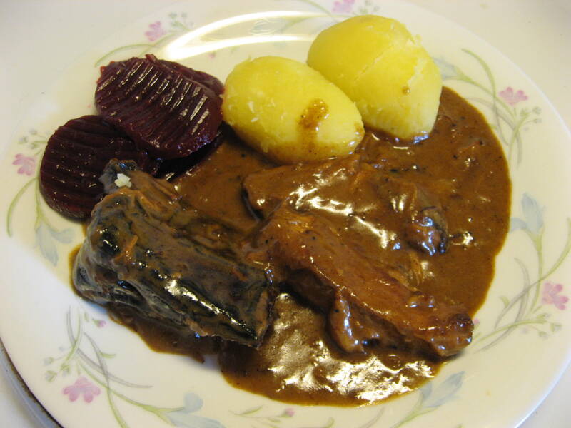 4. Skär upp köttet och lägg ner i grytan tillsammans med såsen. Servera med kokt potatis och grönsaker som man vill ha. För egen del tycker jag det är jättegott med rödkål och kokta morötter till detta.