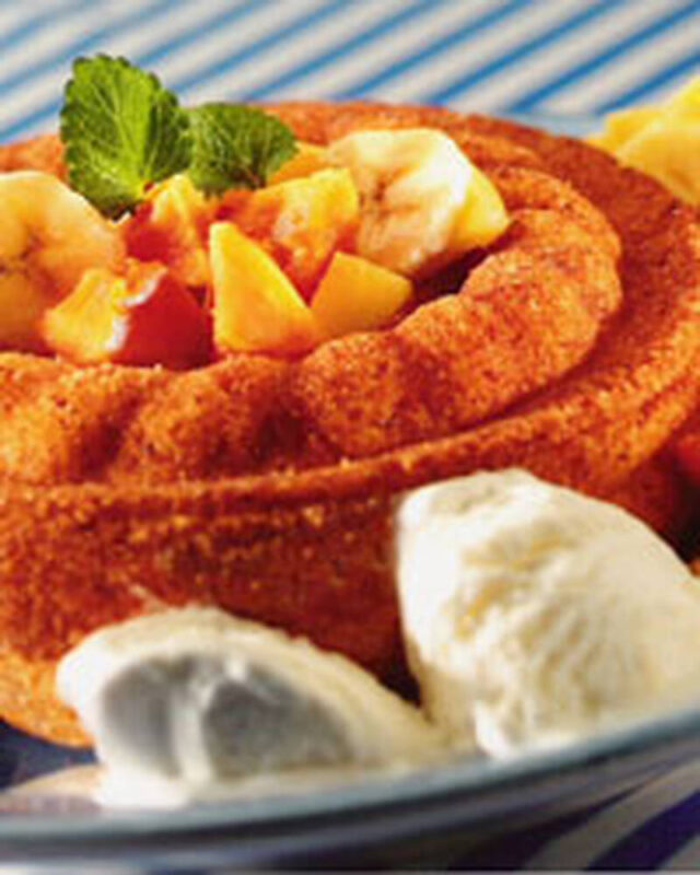 4. Servera kakan på stort serveringsfat och fyll hålet med frukt. Lägg resten av frukten och skivad glass runt kakan.