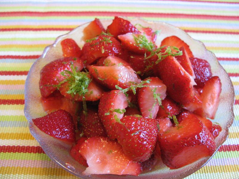 4. Häll limelagen över jordgubbarna och strö limeskalet över.