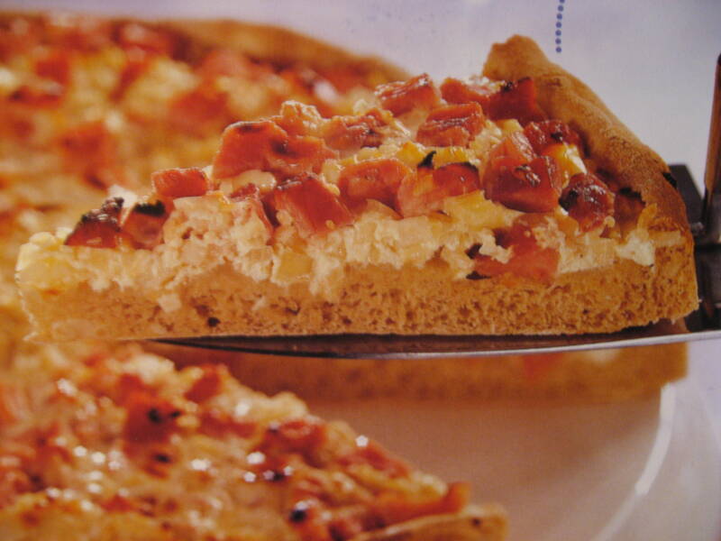 Det här pajen är en fransk variant av italienarnas pizza. Brödet täcks med crème fraiche, lök och rökt skinka.