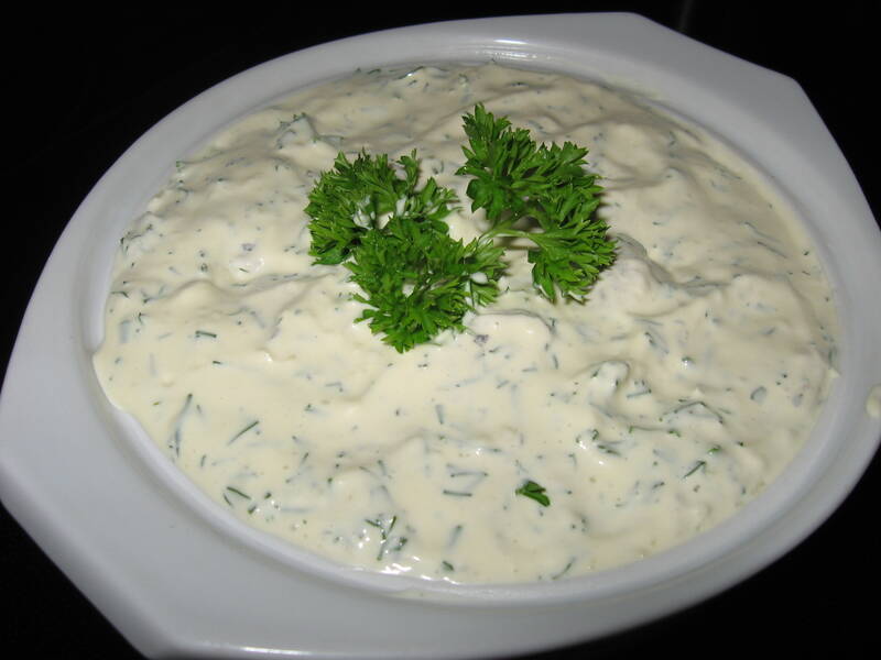 4. Rör ihop majonäs, crème fraiche, persilja, dill, dragon och pressad vilök.