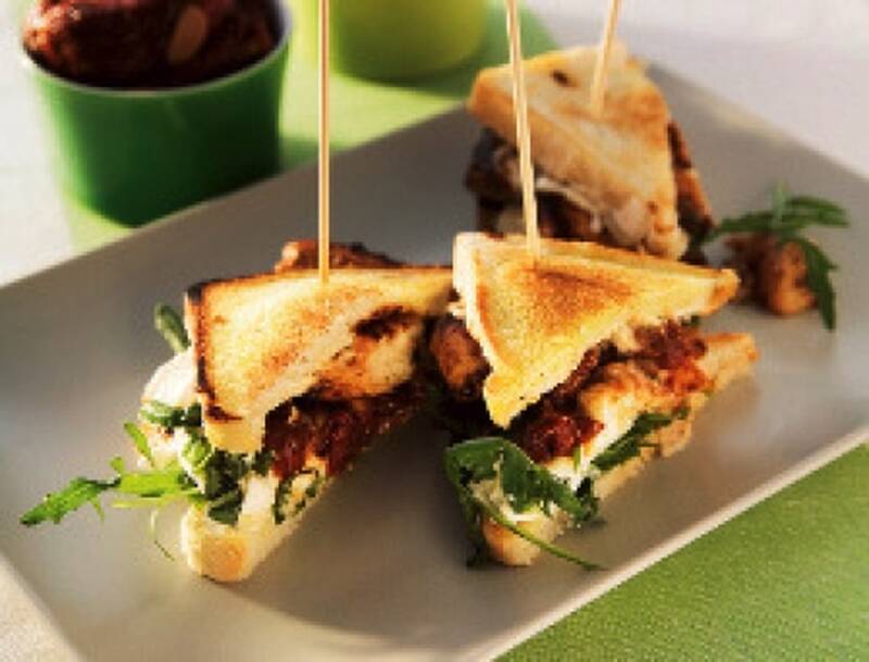 En klassisk clubsandwich innehåller förutom kyckling majonnäs, sallad, tomat och knaperstekt bacon. Här är allt utom kycklingen utbytt mot mozzarellaost, basilika och soltorkade tomater.