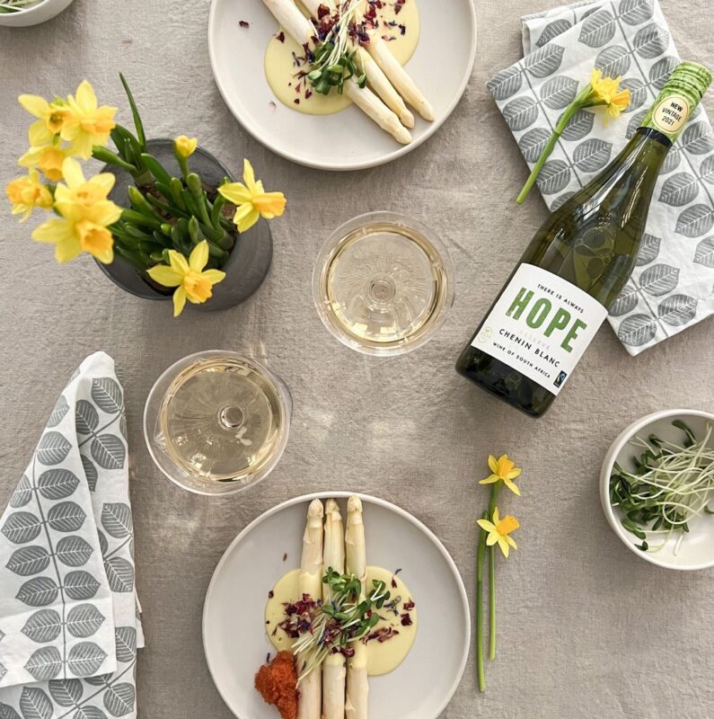 Hope Chenin Blanc passar perfekt till rätter av fisk och skaldjur, eller vegetariska rätter. Prova gärna att matcha vinet med sotad grön sparris tillsammans med syrlig fänkål och brynt hasselnötssmör.